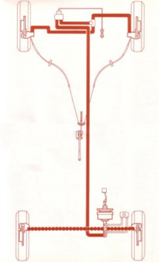 Une répartiteur se trouve au niveau du pont arrière. Souvent oubliée lors des révisions, vérifier que la durite de freins souples sous la caisse entre la caisse et le pont est en bon état.